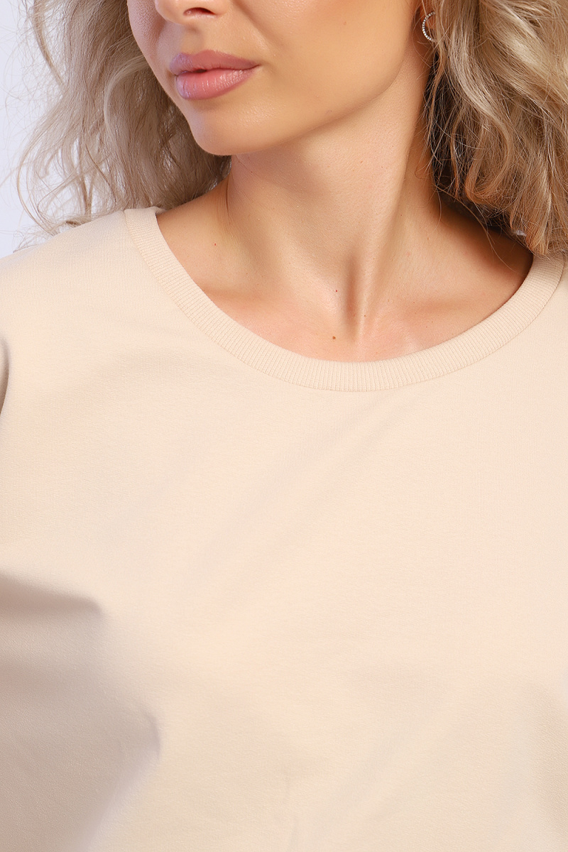 Костюм женский для повседневной носки. Данная модель выполнена из трикотажного полотна футер 2-х нитка. Толстовка свободного покроя с втачным рукавом. Манжеты на рукавах и горловина выполнены из эластичного трикотажного полотна кашкорсе. Пояс на толстовке и брюках выполнены из основной ткани под поясную машинку (отделочная тройная строчка). Брюки имеют по бокам карманы. По низу брюк вшита резинка 2,5 см.