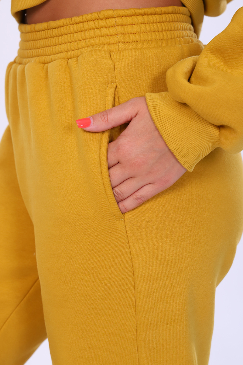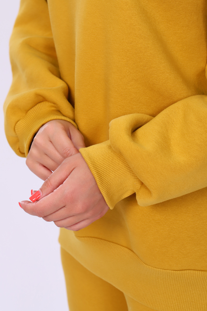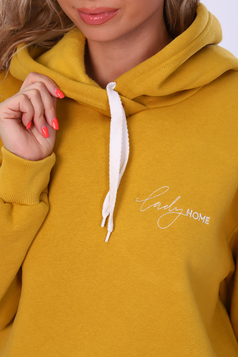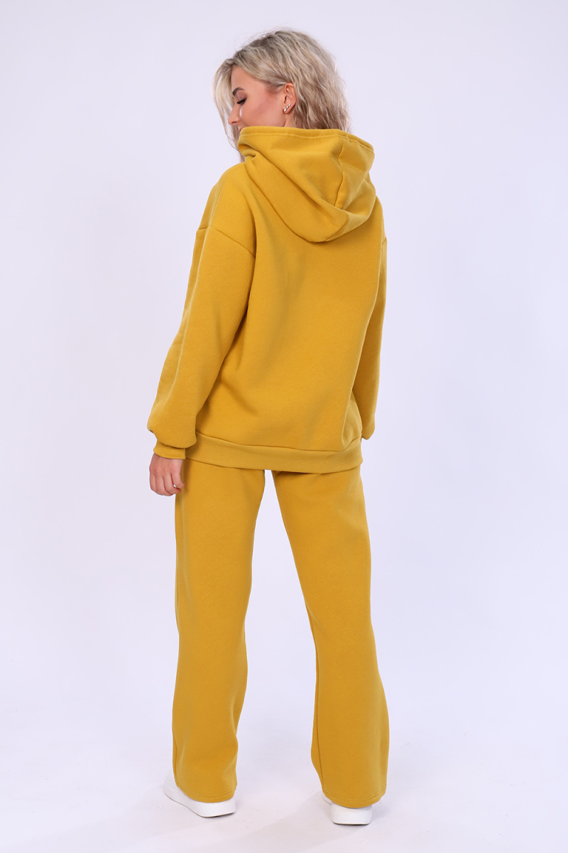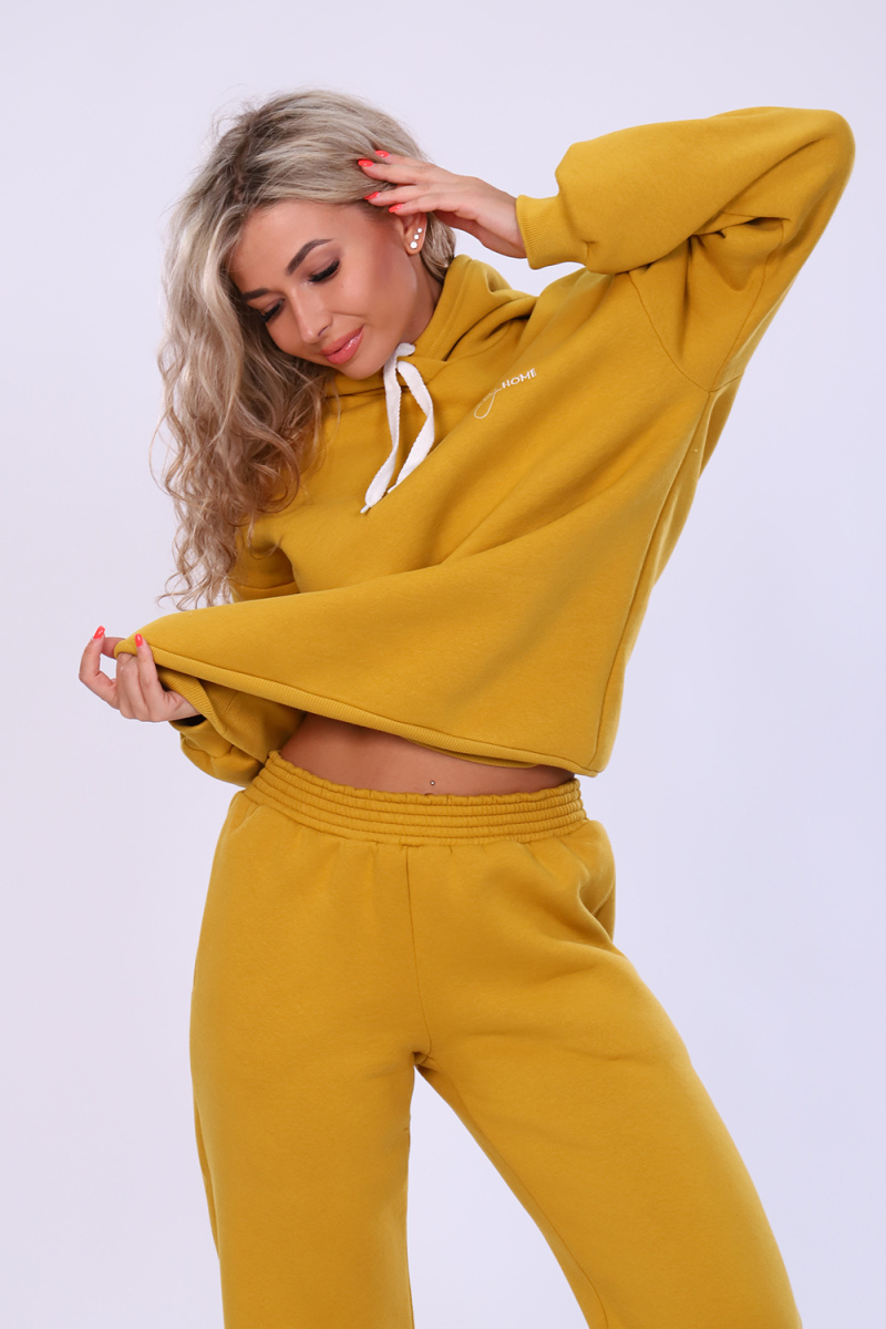 Костюм состоит из толстовки с капюшоном и брюк, из приятной мягкой ткани. Капюшон фиксируется шнуром. Пояс и рукав толстовки на манжете, на полочке вышивка. Брюки с карманами. Модель особенно удобна и комфортна в прохладное время года.