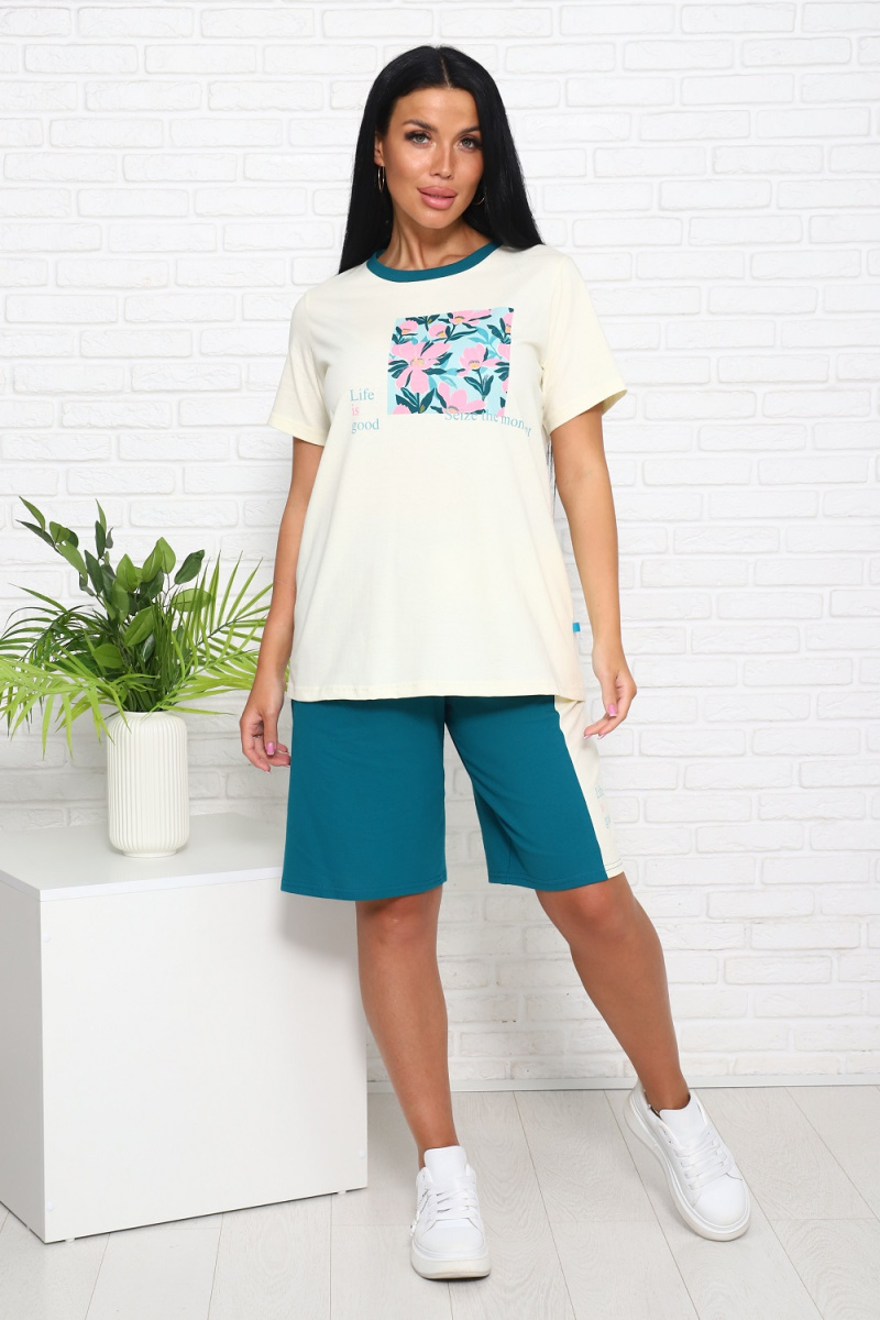 Костюм женский летней тематики: футболка с принтом, свободного кроя, шорты-бермуды оригинального кроя, с принтом а левой штанине, с боковыми удобными карманами и комфортным поясом.